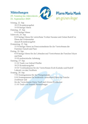 Mitteilungen der Woche - 25. Sonntag im Jahreskreis 2025