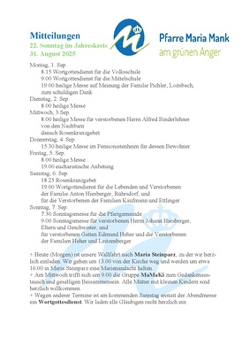 Mitteilungen der Woche - 22. Sonntag im Jahreskreis 2025