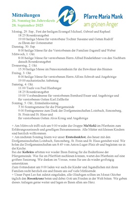 Mitteilungen der Woche - 26. Sonntag im Jahreskreis 2025